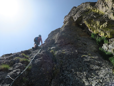 Quart llarg, sortim per un esperó que ens porta a una placa (6b+ o A0/Ae) abans d'arribar a la R4.