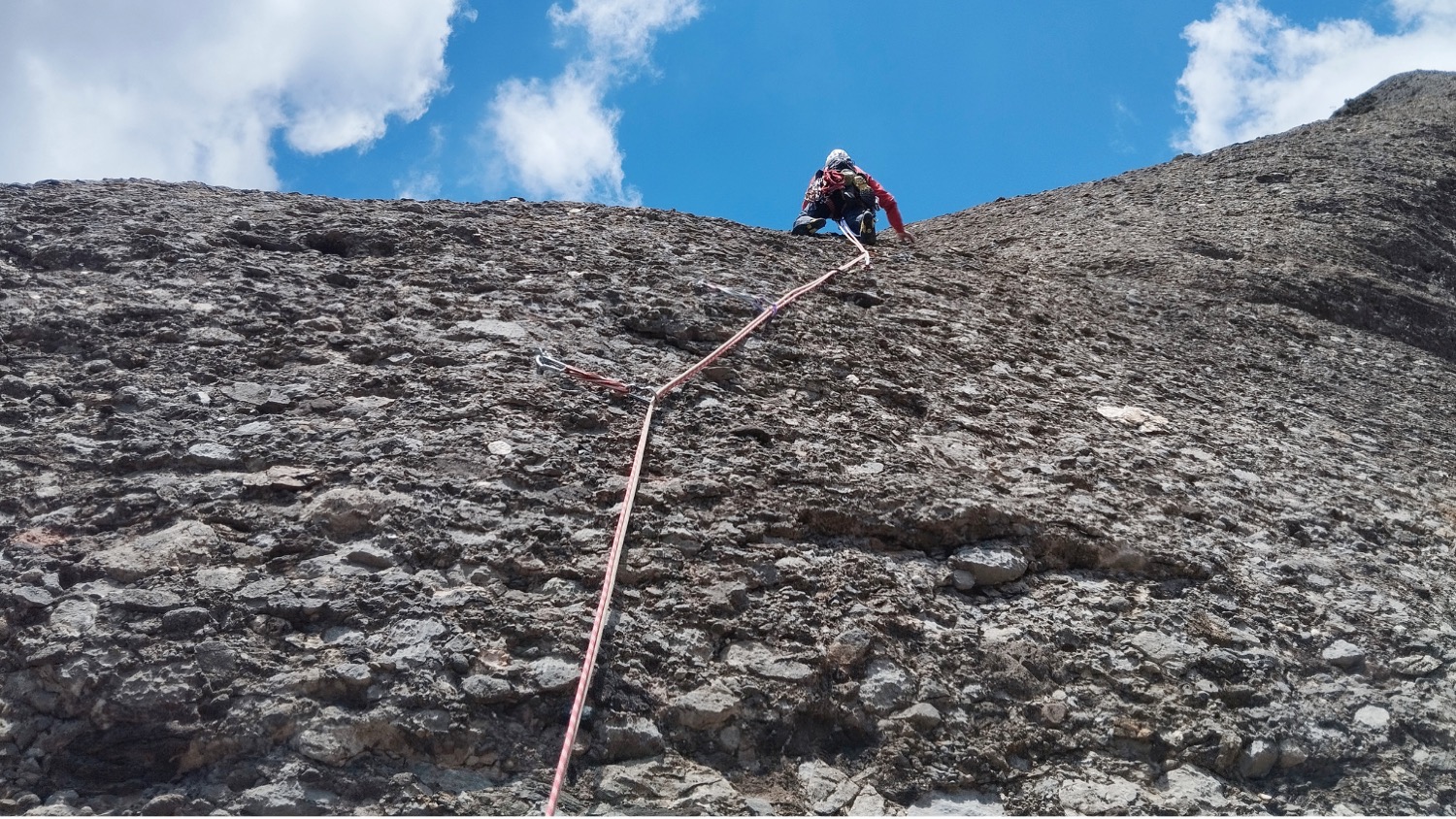Primer llarg, comença per un ressalt vertical després del tercer parabolt allarga per arribar al quart, després ja és deixa fer millor, la placa s'ajeu i seguim fins el segon ressalt on tornem a trobar un tram exigent. A partir d'aquí ja anem fent fins arribar a la R1.
